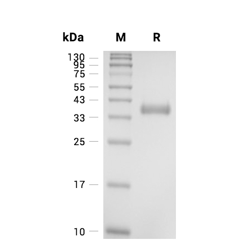 Approximately 35-40 kDa band in SDS-PAGE under reducing conditions due to the glycosylation.