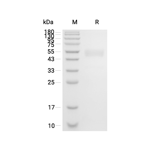 Approximately 45-58 kDa, based on SDS-PAGE under reducing conditions, due to the glycosylation.