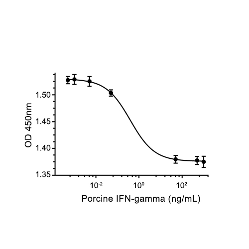 IFN-gamma (interferon-gamma) is a type II interferon produced by immune cells such as T cells and NK cells. It plays a key role in antibacterial, antiviral and anti-tumor responses by activating effector immune cells and enhancing antigen presentation. effect. Its main signaling pathway involves the JAK-STAT pathway that interacts with its receptor IFNGR1, affecting gene regulation. IFN-gamma Protein, Pig is the recombinant Pig-derived IFN-gamma protein, expressed by E. coli , with tag free.