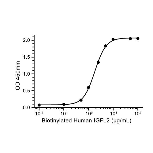 • Measured by its binding ability in a functional ELISA. Immobilized Recombinant Human IGFLR1 at 2 µg/mL can bind Human IGFL2. The ED50 for this effect is 1.811 μg/mL..
