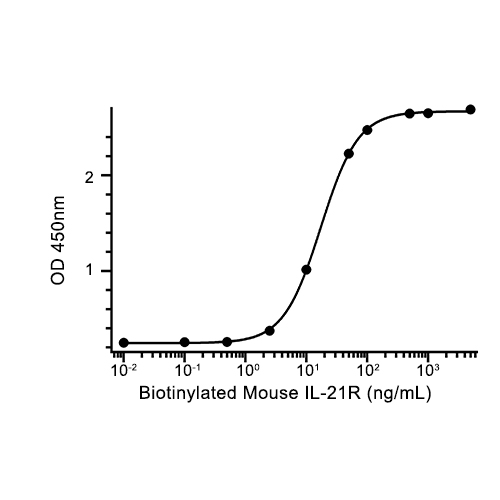 2.Measured by its binding ability in a functional ELISA. When Mouse IL-21 is coated at 5 μg/mL (100 μL/well) can bind Biotinylated Mouse IL-21R. The ED50 for this effect is 17.34 ng/mL.