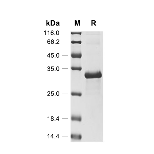 Approximately 30-35 kDa, based on SDS-PAGE under reducing conditions.