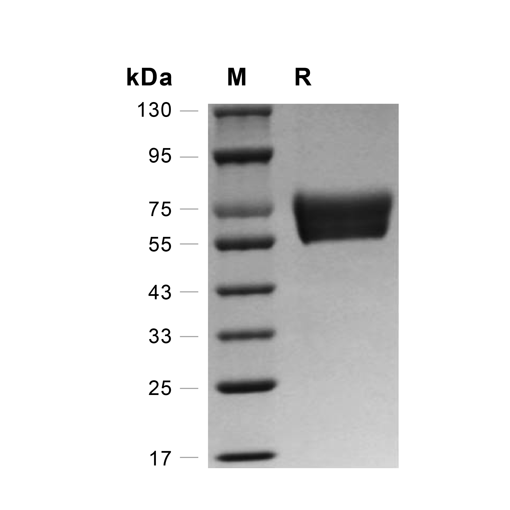The protein migrates as approximately 55-78 kDa under reducing SDS-PAGE due to glycosylation.