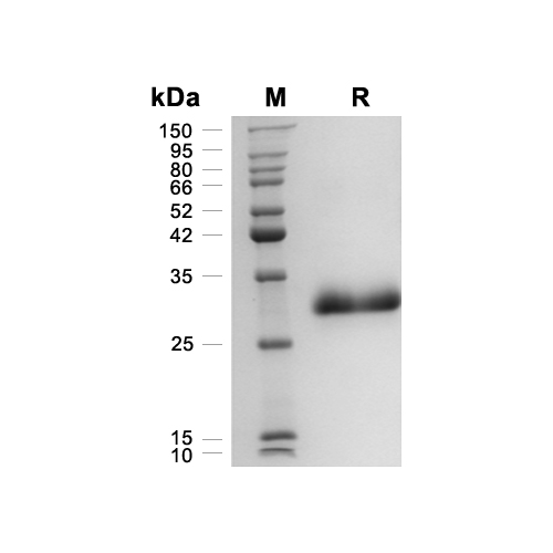 Approximately 28-32 kDa, based on SDS-PAGE under reducing conditions, due to the glycosylation.