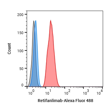 • Flow cytometric analysis of 1X10^6 10 ng/mL PMA and 1 μg/mL Ionomycin co-stimulated Jurkat cells(24h) labeling Retifanlimab (HY-P99941, red). Cells were fixed with 4% paraformaldehyde. Then stained with the primary antibody at 1/200 dilution for an hour at 4℃. Alexa Fluor® 488-conjugated AffiniPure Goat Anti-Human IgG H&L (HY-P83776) was used as the secondary antibody at 1/1,000 dilution for 30 minutes at 4℃. Human IgG4 kappa (HY-P99003, blue) was used as the isotype control, cells without incubation with primary antibody were used as the unlabeled control (black).