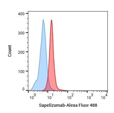 • Flow cytometric analysis of 1.5×106 U937 cells with Sapelizumab (HY-P990662, red). Cells were fixed with 4% paraformaldehyde and permeabilised with 90% methanol. Then stained with the primary antibody at 1/200 dilution for an hour at 4℃. Alexa Goat Anti-Human IgG H&L (AF488) (HY-P83776) was used as the secondary antibody at 1/1,000 dilution for 30 minutes at 4℃. Human IgG2 kappa Isotype Control (HY-P99002, blue) was used as the isotype control.