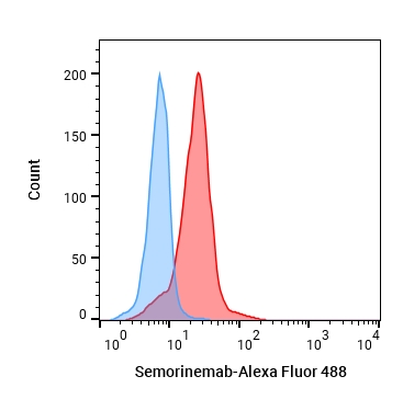 • Flow cytometric analysis of 1.5X106 SHSY5Y cells with Semorinemab (HY-P99399, red). Cells were fixed with 4% paraformaldehyde. Then stained with the primary antibody at 1/200 dilution for an hour at 4℃. Goat Anti-Human IgG H&L (AF488) (HY-P83776) was used as the secondary antibody at 1/1,000 dilution for 30 minutes at 4℃. Human IgG4 kappa, Isotype Control (HY-P99003, blue) was used as the isotype control.