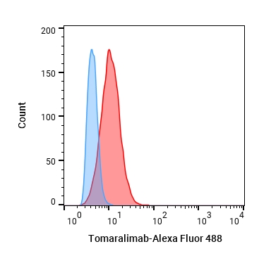 • Flow cytometric analysis of 1.5X106 THP-1 cells with Tomaralimab (HY-P99555, red). Cells were fixed with 4% paraformaldehyde. Then stained with the primary antibody at 1/200 dilution for an hour at 4℃. Goat Anti-Human IgG H&L (AF488) (HY-P83776) was used as the secondary antibody at 1/1,000 dilution for 30 minutes at 4℃. Human IgG4 (S228P) kappa, Isotype Control (HY-P99003, blue) was used as the isotype control, cells without incubation with primary antibody were used as the unlabeled control (black).