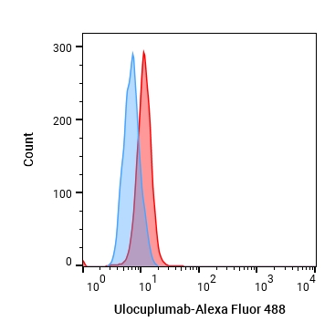 • Flow cytometric analysis of 1.5×106 THP-1 cells with Ulocuplumab (HY-P99272, red). Cells were fixed with 4% paraformaldehyde and permeabilised with 90% methanol. Then stained with the primary antibody at 1/200 dilution for an hour at 4℃. Alexa Goat Anti-Human IgG H&L (AF488) (HY-P83776) was used as the secondary antibody at 1/1,000 dilution for 30 minutes at 4℃. Human IgG4 (S228P) kappa Isotype Control (HY-P99003, blue) was used as the isotype control, cells without incubation with primary antibody were used as the unlabeled control (black).