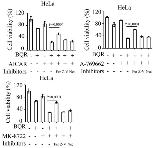 Cell viability of HeLa cells treated with brequinar (0.3 μM) or/and AICAR (40 μM)/A-769662 (200 μM)/MK-8722 (1 μM) for 72 h following pretreatment with vehicle or cell death inhibitors for 24 h. Ferr-1 (10 μM), Z-VAD-FMK (10 μM), necrosulfonamide (2 μM).