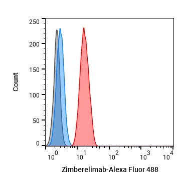 • Flow cytometric analysis of 1X106 10 ng/mL PMA and 1 μg/mL Ionomycin co-stimulated Jurkat cells (24h) with Zimberelimab (HY-P99109, red). Cells were fixed with 4% paraformaldehyde. Then stained with the primary antibody at 1/200 dilution for an hour at 4℃. Alexa Fluor 488-conjugated AffiniPure Goat Anti-Human IgG H&L (HY-P83776) was used as the secondary antibody at 1/1,000 dilution for 30 minutes at 4℃. Human IgG4 lambda1 (HY-P99987, blue) was used as the isotype control, cells without incubation with primary antibody were used as the unlabeled control (black).